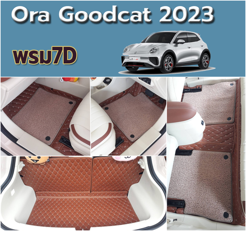 พรมรองพื้นรถยนต์ Ora Goodcat 2023 สีน้ำตาลเข้มด้ายทอง เสริมไวนิลดักฝุ่นสีครีม |